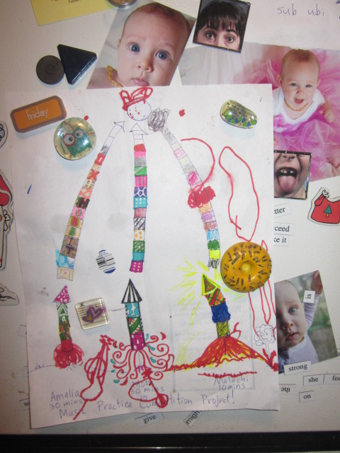 Okay, here goes: on the sheet of paper, I drew three rockets heading toward the moon. The rockets and the paths to the moon were divided up into an equal number of segments. I wrote each of our names under a rocket, and the time I wanted each of us to put in every day: Malachi, 10 minutes, Amalia, 30 minutes, and me, 30 minutes. I announced my plan to the kids, cheerfully, though (truth is) I had absolutely no idea if this scheme would work for them or for me, either, both, or neither. Who knows when brilliance will stick?